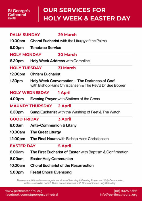 The service times are set out in the image below. These will be times of liturgical focus, supported, where appropriate, by exquisite choral music. Together, we will experience the highs and the lows of Holy Week, and together we will come to a deeper knowledge and experience of the mystery that is our common faith.